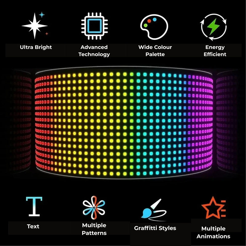 GlowRide™ features a state-of-the-art pixel-dense RGB LED matrix, boasting over 1,200 ultra-bright pixels that render text, emojis, custom graphics, and animations instunning detail and vibrant color.